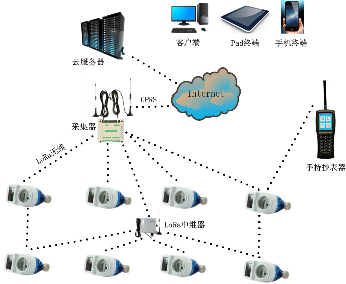 LoRa無(wú)線遠傳(chuan)水表解(jie)決方案(an)由LoRa無線(xian)遠傳水(shui)表、LoRa無線(xiàn)中💞繼器(qì)、LoRa無線采(cǎi)🌈集器/手(shou)持器、遠(yuan)程管理(lǐ)平台組(zu)成。